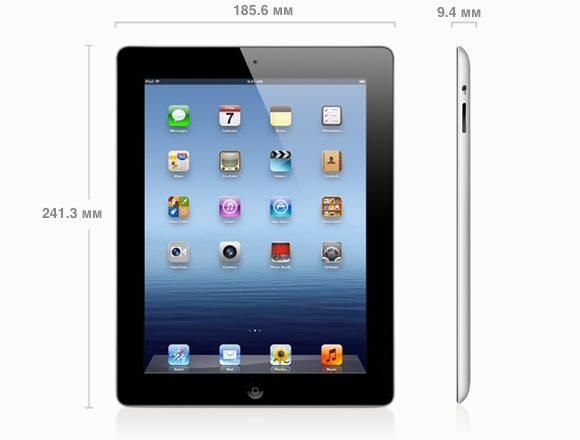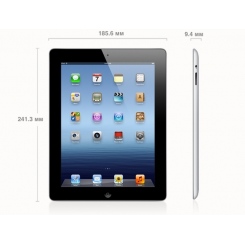 ОС: iOS 5. Процессор: двухъядерный Apple A5X (1 ГГц) с четырехъядерной графикой (PowerVR SGX543MP4). Память: 16. Вес: 652 г. Размер: 241.2*185.7*9.4 мм. Батарея: 11560 mA. Экран: Retina. Размер, д.: 9.7. Камера: 5 МП , Wi-Fi, Bluetooth, 3G, GPS.